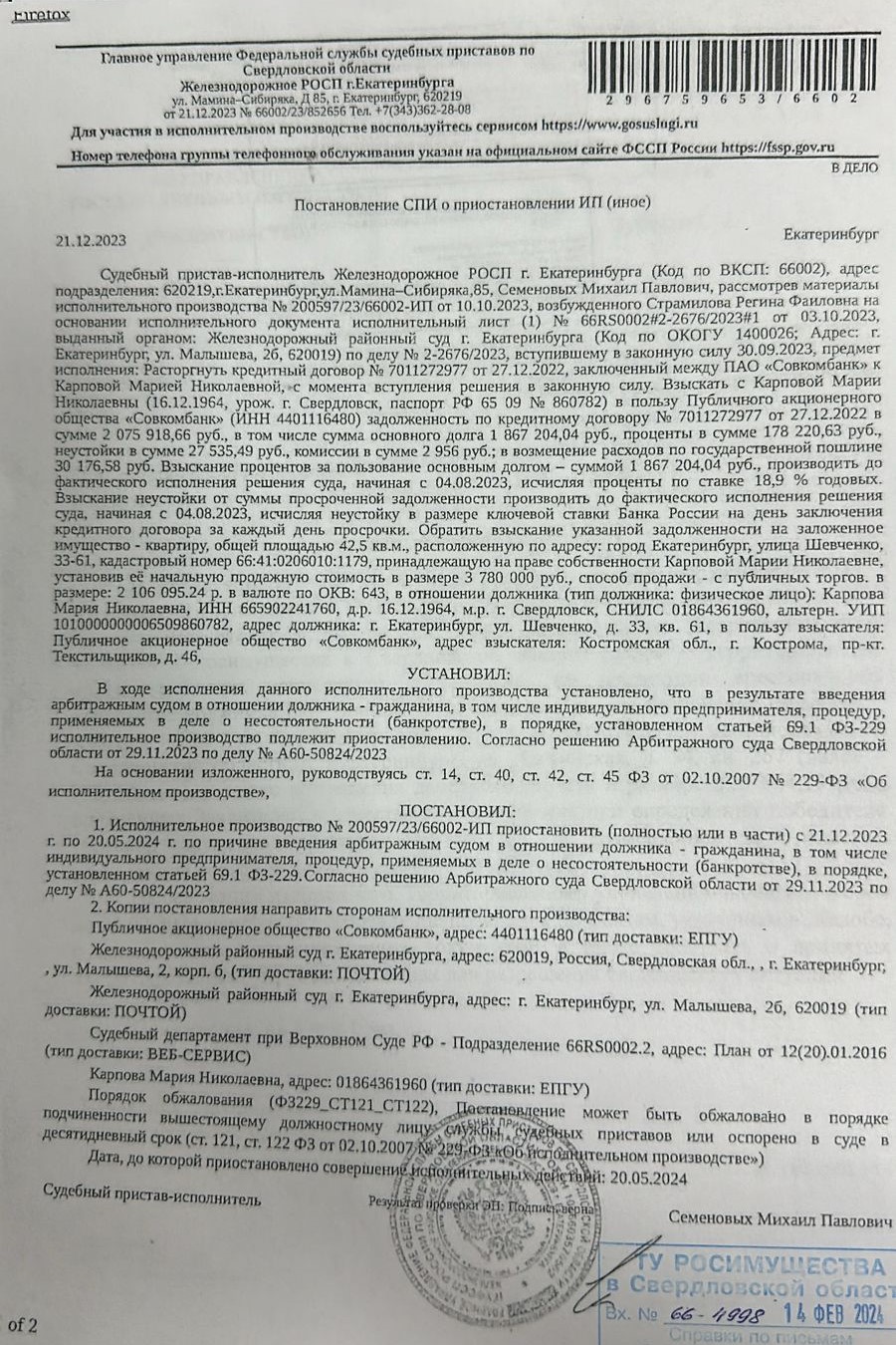 Жилое помещение, квартира, площадь 42,5 кв. м., кадастровый № 66:41:0206010:1179, должник Карпова М.Н. Уведомление ТУ Росимущества в СО от 17.11.2023 № 02-4284/23. Адрес объекта: Свердловская область, г. Екатеринбург, ул. Шевченко, д. 33, кв. 61. Минимальная начальная цена 3780000р. Сумма задатка 189000р